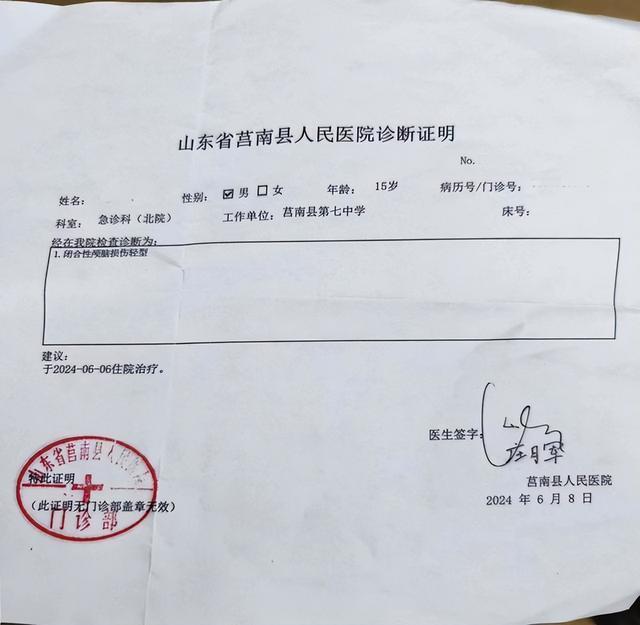 记者联系到视频发布者,其复述了事情过程,并提供了该男生的诊断书,显示是 " 闭合性颅脑损伤轻型 "。