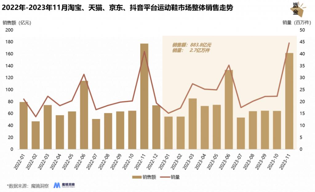 22 年 -23 年 11 月淘宝、天猫、京东、抖音运动鞋市场销售走势