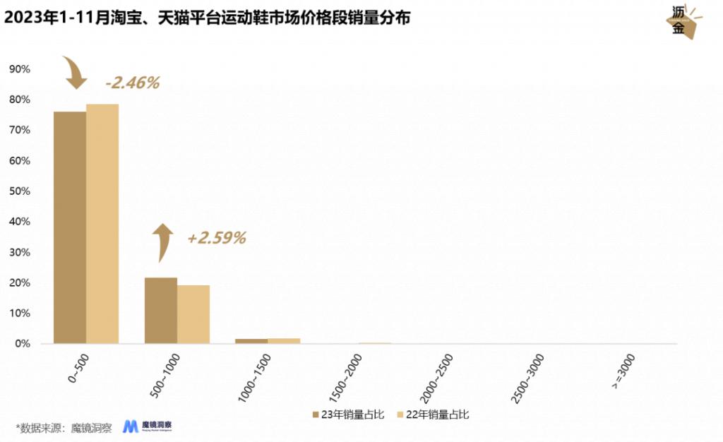 千元以下是运动鞋市场的主流价格段,其中 0-500 元销量占比高达 76%。