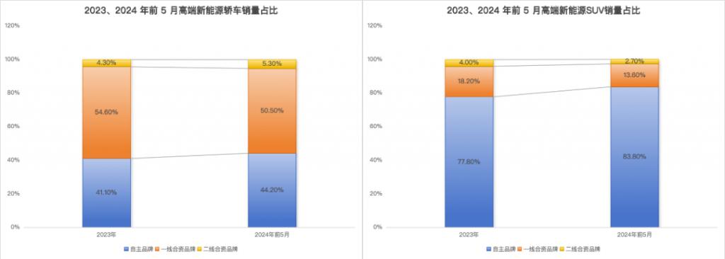 一方面是,高端新能源市场的 SUV 和轿车渗透率差距较大,2023-2024 年前 5 月,30 万以上 SUV 销量约为 156.7、62 万辆,其中新能源渗透率分别为 43.6%、44.0%。