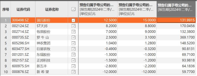 其中,行业龙头股牧原股份预计上半年实现归母净利润 7-9 亿元,同比增长 125.19%-132.28%,上年同期为亏损 27.79 亿元;预计实现扣非后归母净利润 9-11 亿元,上年同期为亏损 27.96 亿元。