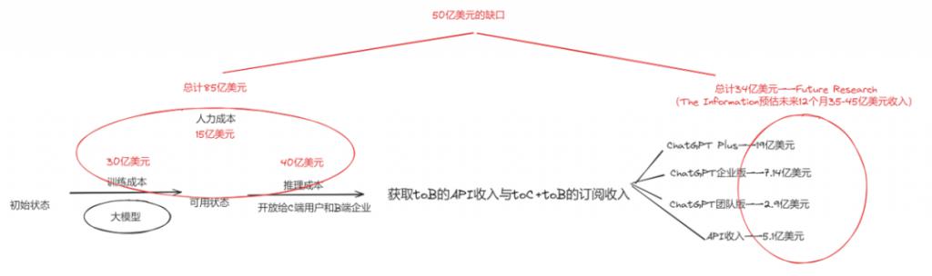 参考过去一年的运营数据再结合如今的情况看,OpenAI 今年大概会出现 50 亿美元的资金缺口。我们知道一个公司能否运转下去,最根本的还是要看现金流。如果假设 OpenAI 一年就是 50 亿美金的缺口,且不再加大投入,微软在 2023 年 1 月给到 100 亿美金的投资,也就够撑到 2025 年年底(2023 年的资金缺口应该没有 50 亿美元那么大)。