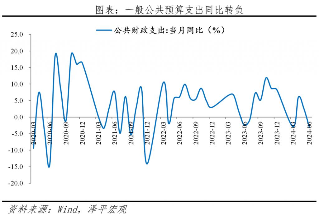 一般性预算支出回落,财政支出仍需发力。6 月,一般公共预算支出同比由正转负,较 5 月下行 5.6 个百分点。分中央和地方来看,中央支出同比 7.4%,较 5 月的 9.2% 下降 1.8 个百分点;地方支出同比 -4.4%,较 5 月的 1.5% 下降 5.7%,地方降幅较大。支出端一般性预算支出增速转负,一方面是受收入端表现低迷影响,另一方面与地方债发行速度偏慢有关。