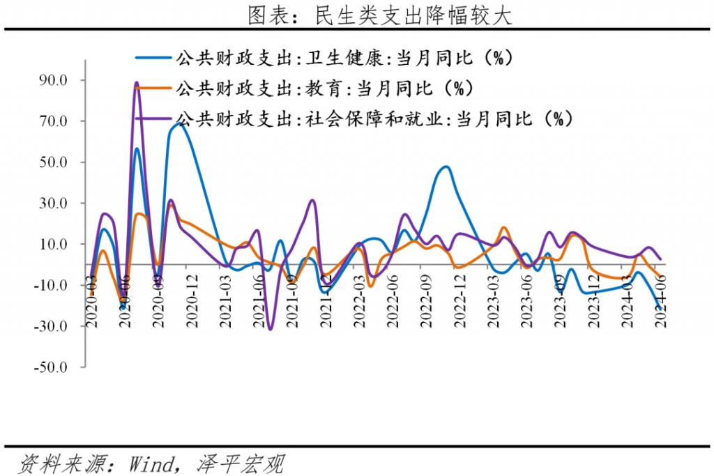 1)民生类支出降幅较大。6 月,民生类支出同比 -6.7%,较 5 月的 0.4% 显著回落。其中,与民生类相关的社会保障和就业、卫生健康、教育支出同比分别为 2.6%、-21.7%、-5.9%;卫生健康和教育支出同比较上月分别下降 10.8 个百分点、5 个百分点,社会保障和就业增速较上月回落 5.7 个百分点。多地政府发文 " 过紧日子 ",反映财政支出在稳民生和稳就业等领域有待进一步发力提速。