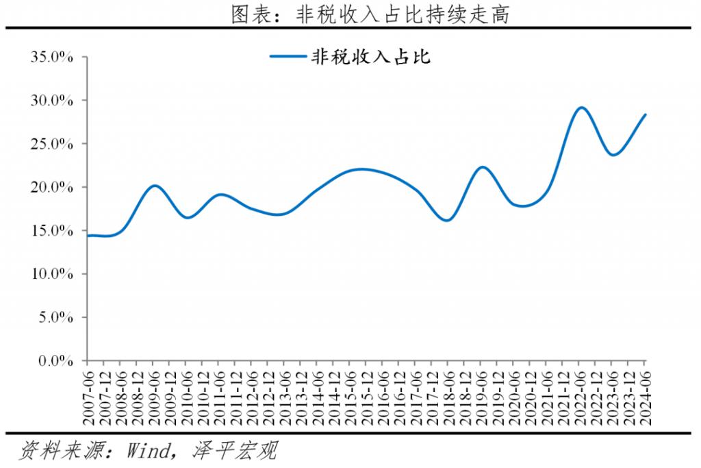 税收降幅扩大,非税收入增速较高。6 月,税收收入新增 13618 亿元,同比 -8.5%,降幅较 5 月扩大,推升非税占比;非税收入新增 5383 亿元,同比较 5 月的 15.8% 上行至 16.4%,达 2023 年以来最高水平。非税收入和税收收入有跷跷板效应,税收收入与经济活动高度相关,税源企业好,税收自然就好;而非税收入主要包括收费、罚没等,往往作为税收收入下行的对冲手段,但实则影响营商环境。