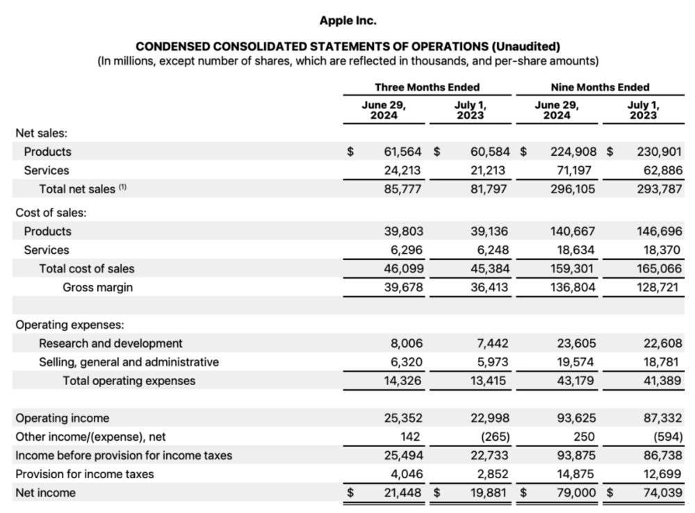 其他产品方面,Mac 收入 70 亿美元,同比增长 3%。服务业务收入 242 亿美元,同比增长 14%。借助新款 iPad Pro 和 iPad Air 的推出,iPad 产品线成为该季度增速最高的业务,收入来到 72 亿美元,同比增长 24%。