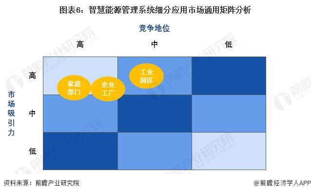 参照通用矩阵理论,前瞻以市场吸引力为纵坐标、竞争地位为横坐标展示智慧能源管理系统下游应用市场的战略地位。其中,家庭部门、企业工厂领域处于强吸引 - 强竞争地位,是智慧能源管理系统未来需重点关注的市场 ; 工业园区领域的智慧能源管理系统由于对园区匹配度、技术和系统的要求更多,目前有一定企业布局,但在政策推动及智慧园区发展趋势下有较大的需求潜力,暂处于强吸引 - 中竞争地位