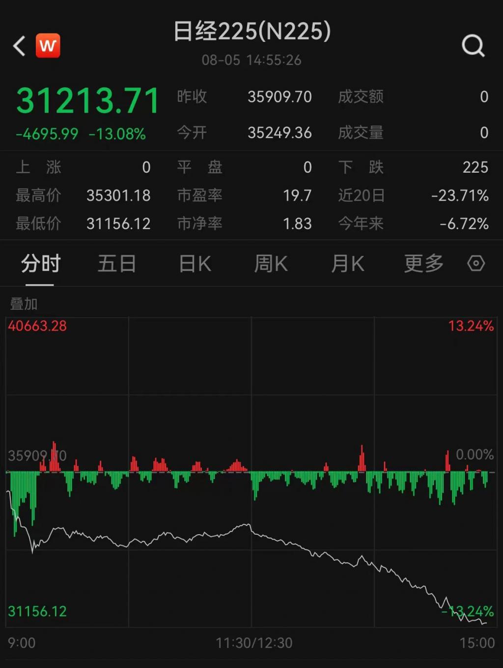 日经 225 指数盘中较上一交易日收盘一度下跌超过 4700 点,跌幅超 13%,创历史最大跌幅。日经 225 指数当天开盘以来已两度触发熔断机制。