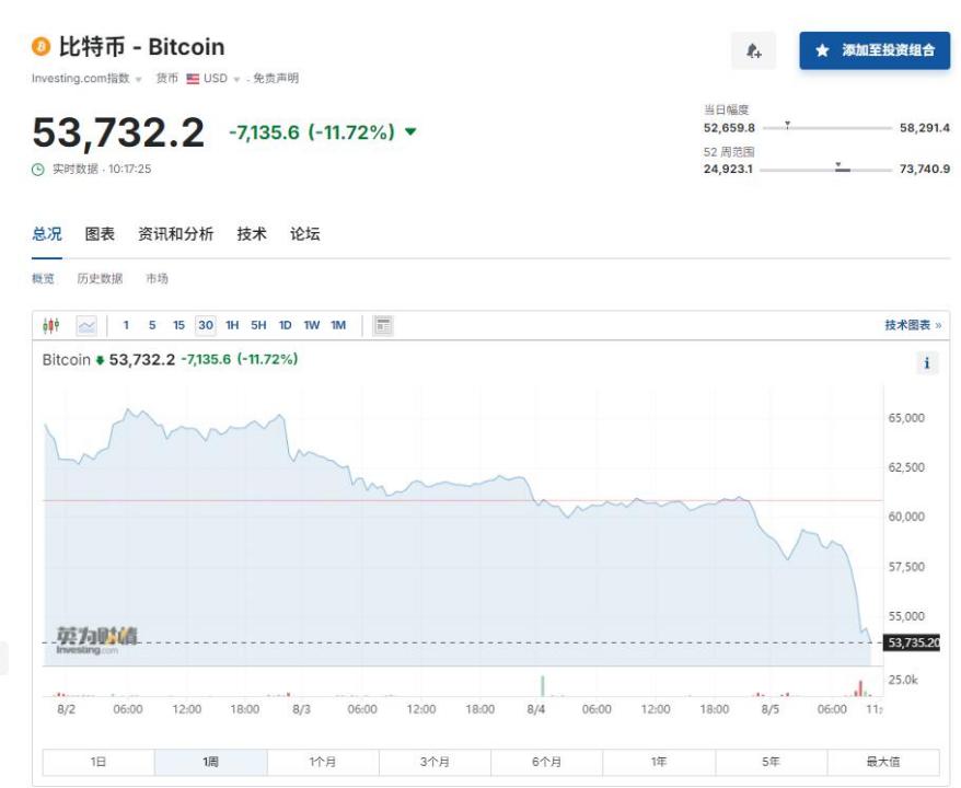 8 月 5 日,加密货币市场也经历一轮大跌。其中,以太坊盘中闪崩,一度暴跌超 26% 并跌破 2100 美元 / 枚;比特币盘中一度跌破 5.3 万美元 / 枚,最低触及 5.26 万美元 / 枚,跌幅超过 10%。