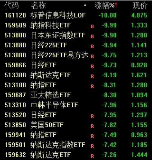 受外围股市暴跌影响,跨境 ETF 持续下挫,日本东证指数 ETF ( 513800 ) 、日经 225ETF ( 513880 ) 、纳指科技 ETF ( 159509 ) 午后跌停,纳斯达克 ETF ( 513300 ) 、日经 225ETF 易方达 ( 513000 ) 、纳指 ETF ( 513100 ) 、日经 ETF ( 159866 ) 等跌超 9%。