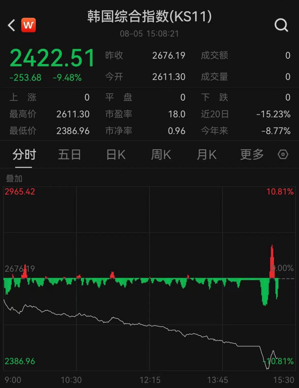 韩国综合指数跌幅扩大至 9.48%,报 2422.51 点,盘中触发熔断机制,暂停交易 20 分钟。