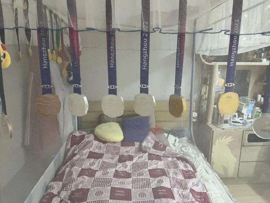 据媒体报道,巴黎奥运会男子 100 米自由泳金牌得主潘展乐在床的蚊帐上沿挂满了大大小小的奖牌,引发网友共鸣:" 潘展乐的冠军‘痛床’,含金量好高的蚊帐!"