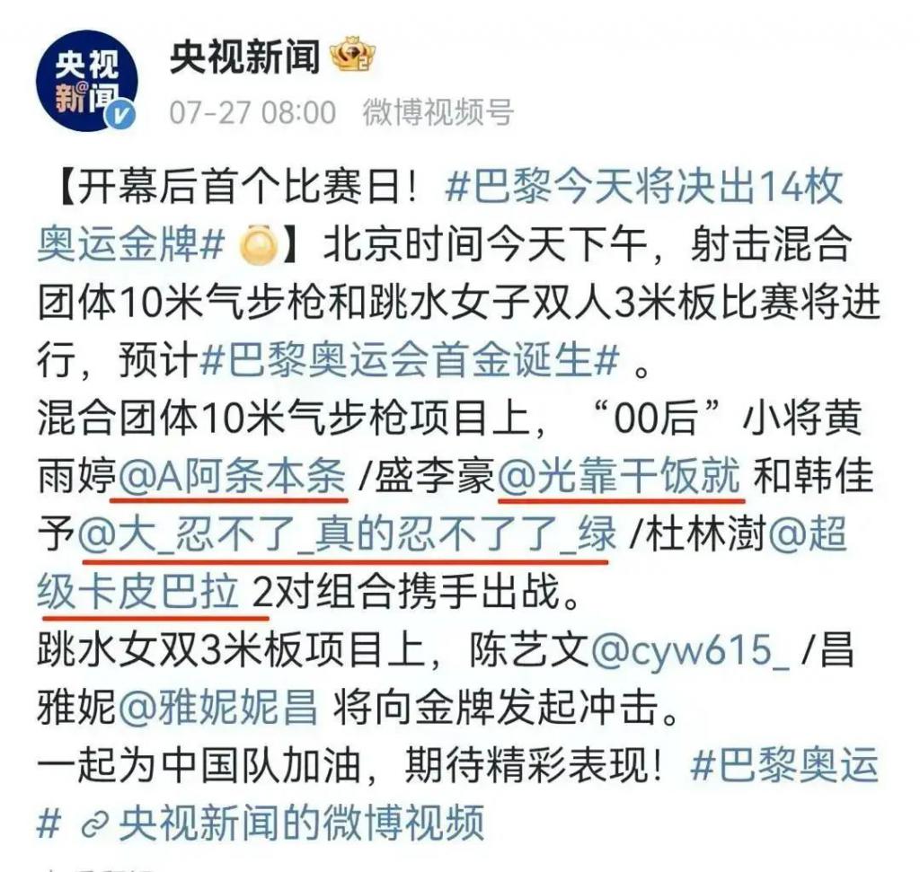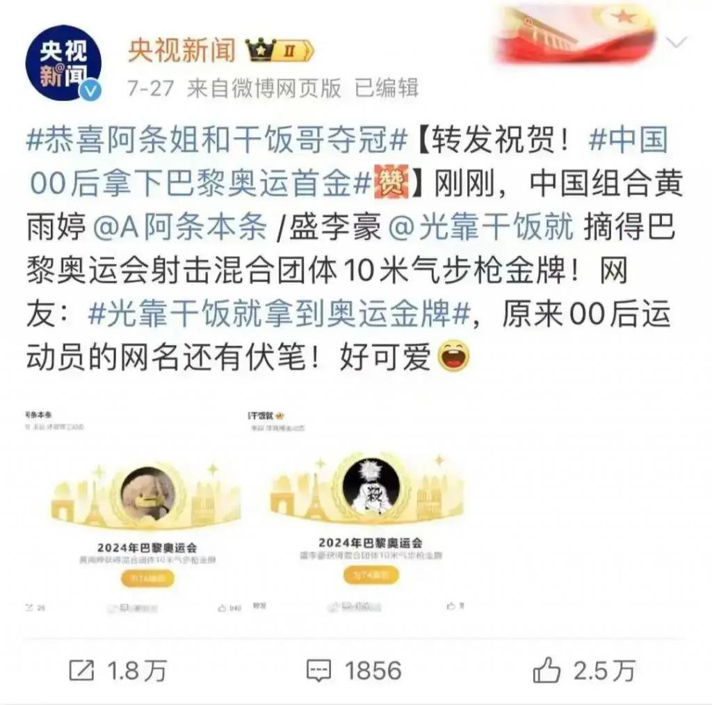 然而奇奇怪怪的网名还没看完,17 岁的 " 阿条姐 " 黄雨婷和 19 岁的 " 干饭哥 " 盛李豪已经替中国代表队拿下奥运首金,媒体纷纷发文庆祝。