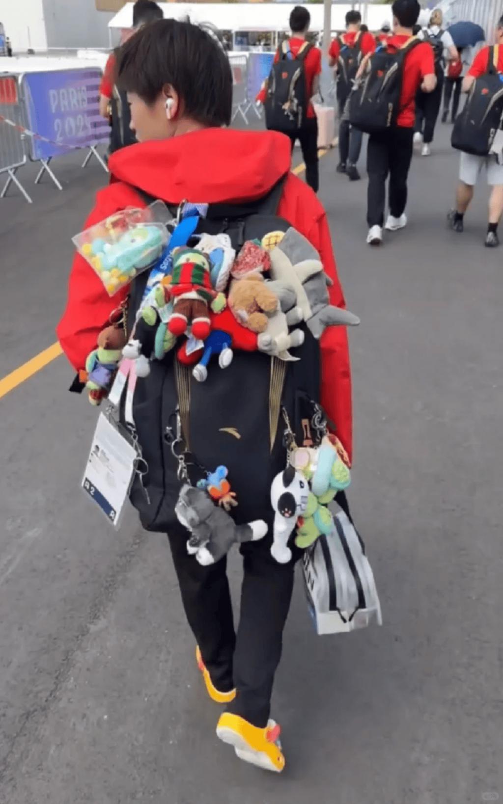 7 月 31 日下午,全红婵 / 陈芋汐夺得巴黎奥运会跳水女子双人 10 米台金牌,赛后采访中,全红婵开心地向大家展示粉丝送的 " 痛包 "。