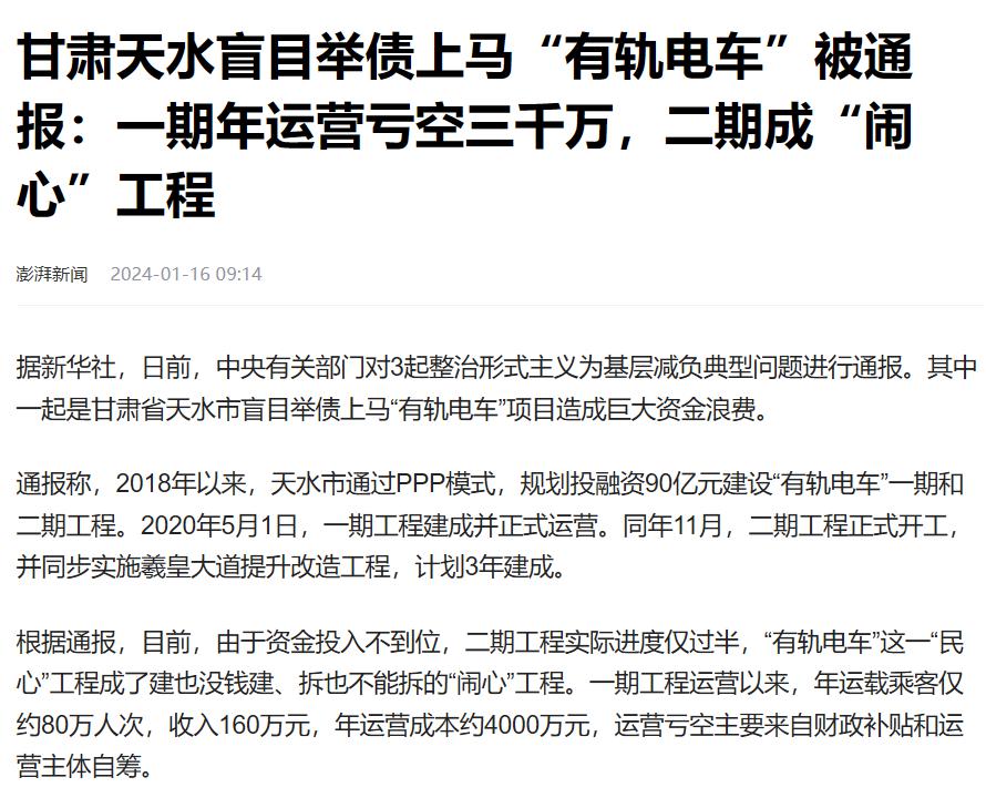 这两天,有关部门通报三起形式主义典型问题,其中一起是甘肃省天水市盲目举债上马 " 有轨电车 " 项目造成巨大资金浪费。