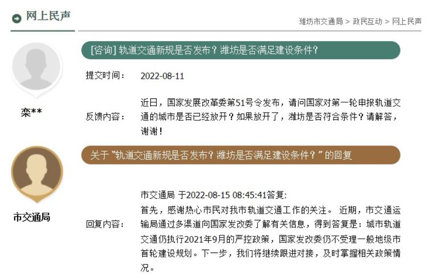 2022 年,有网友询问,潍坊是否符合建地铁条件?潍坊市交通局回复称," 国家发改委仍不受理一般地级市首轮建设规划 "。