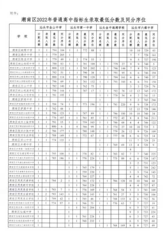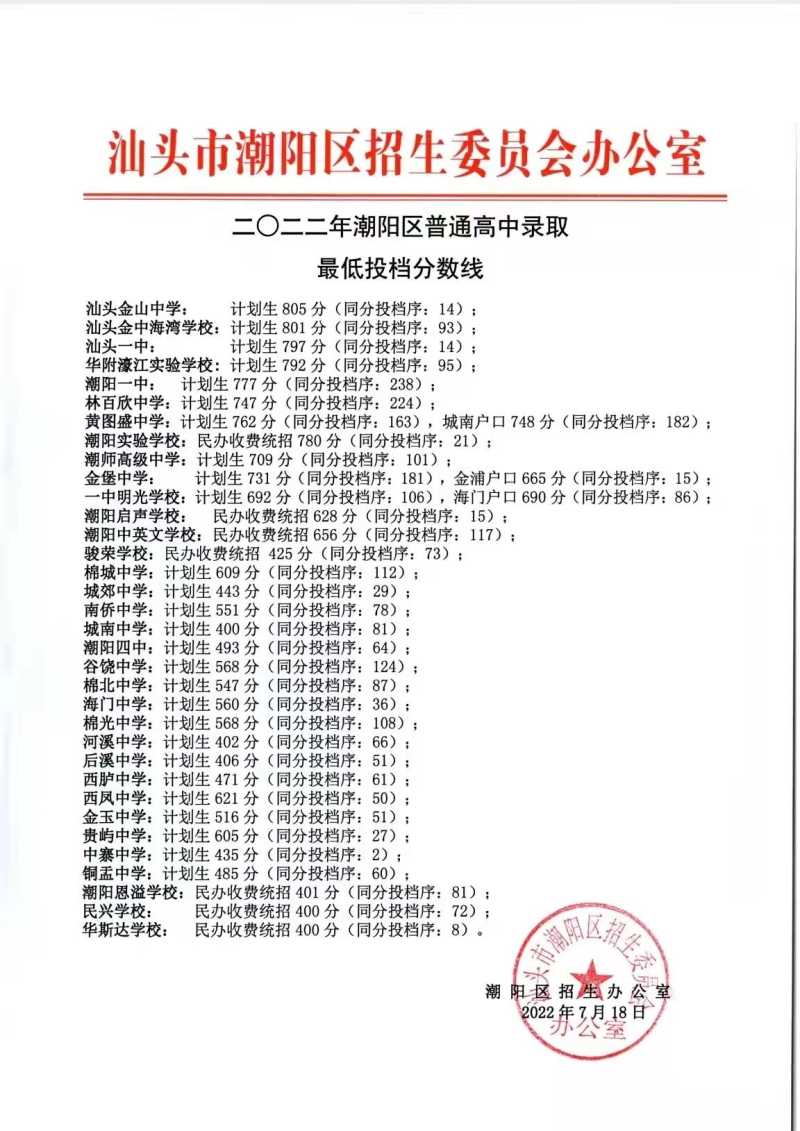 潮阳区2022年普通高中学校录取最低分数及同分最低序位: