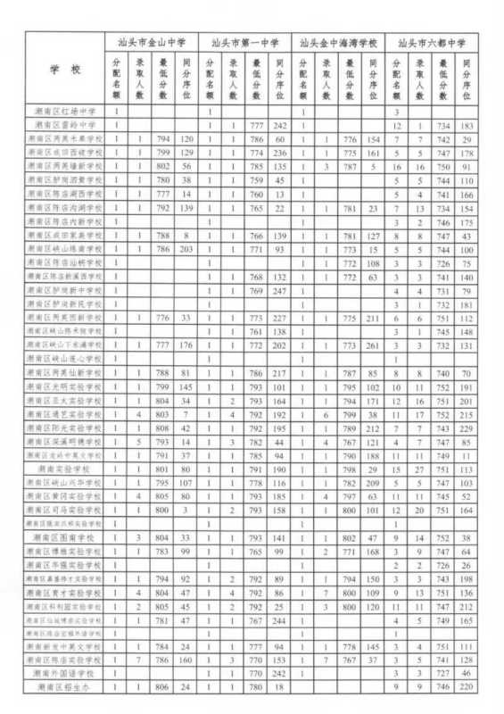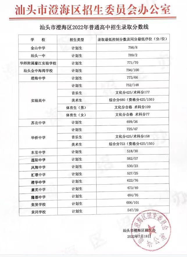 澄海区2022年普通高中学校录取最低分数及同分最低序位: