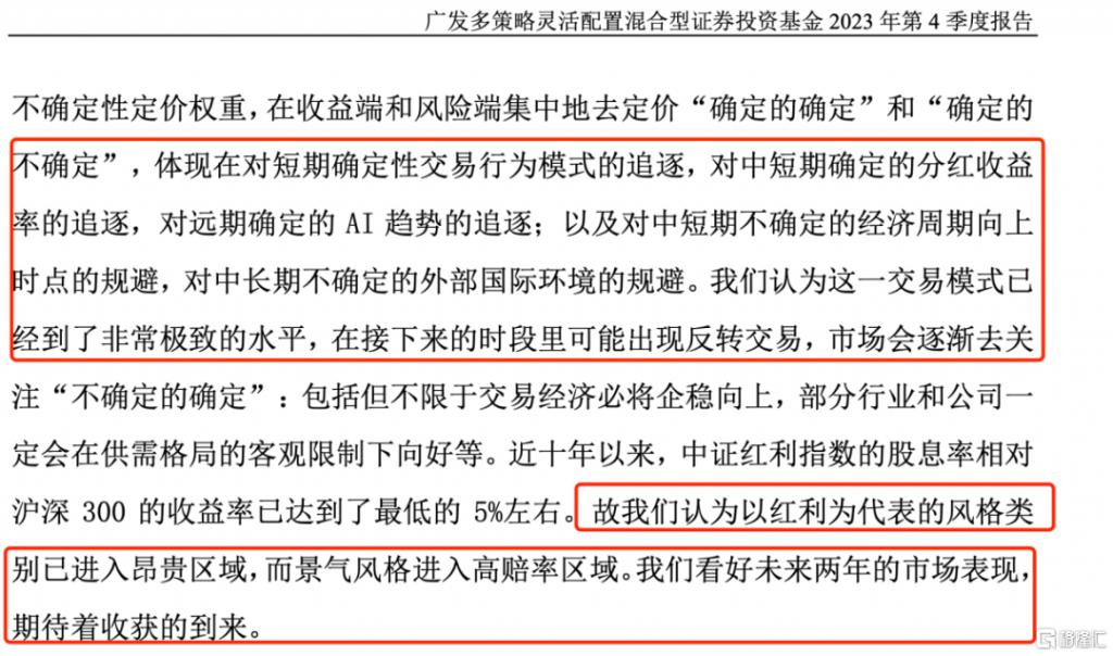 不过广发基金林英睿的观点较为特立独行,在四季报中直言以红利为代表的风格策略已经进入昂贵区域,接下来可能出现反转交易。