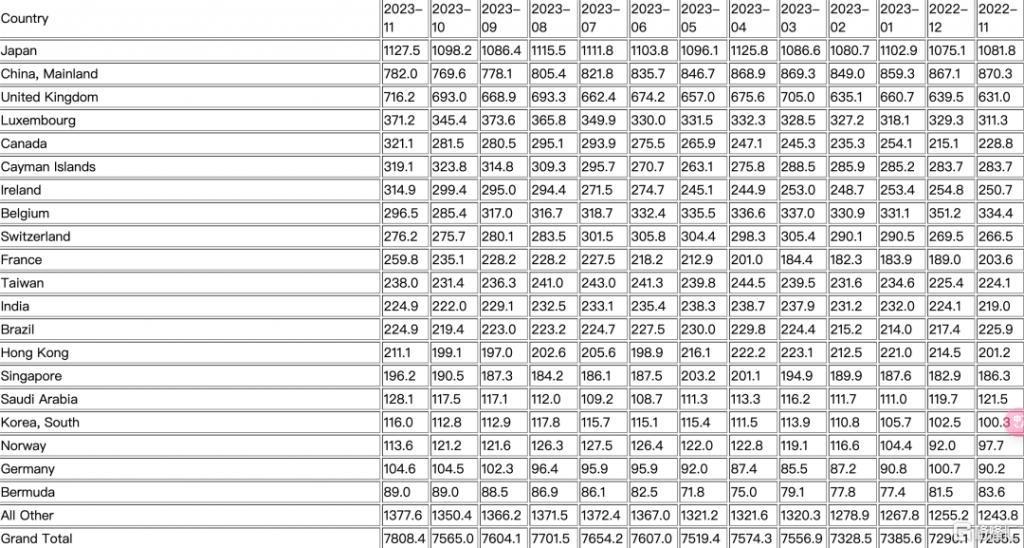 美国财政部公布 11 月国际资本流动报告(TIC)显示,2023 年 11 月,日本的美国国债持仓为 11275 亿美元,较 10 月环比增长 293 亿美元,连续两个月增持。