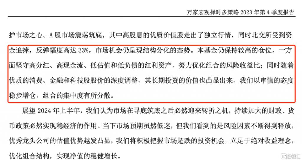 他在四季报中指出,持仓会继续坚守红利资产,但另一方面也会高度关注优质消费 / 金融和科技股的长期投资价值。