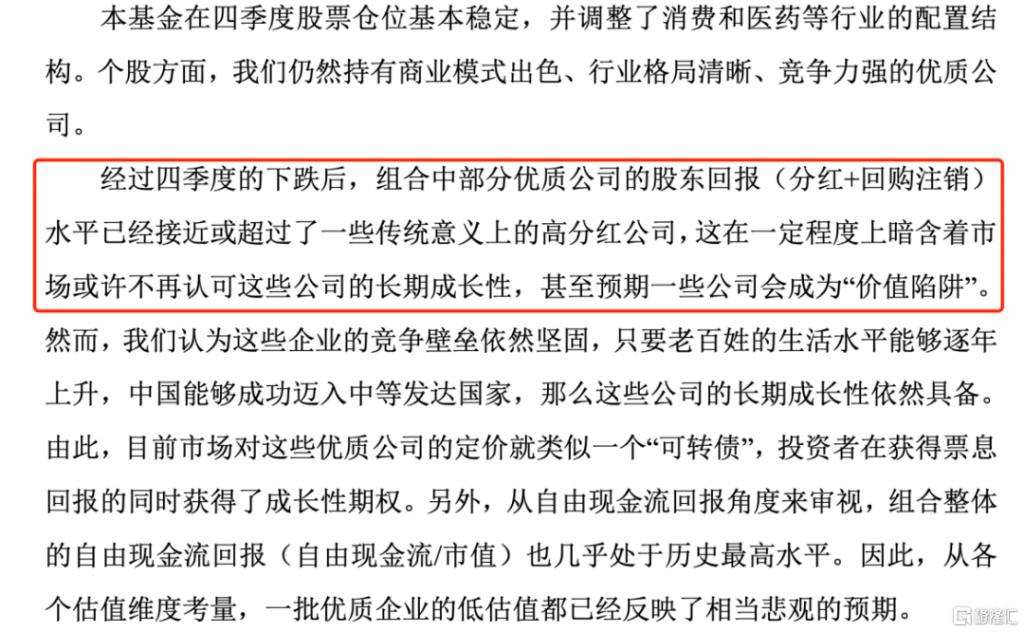 经过四季度的下跌后,组合中部分优质公司的股东回报(分红 + 回购注销)水平已经接近或超过了一些传统意义上的高分红公司。这在一定程度上暗示了,市场或许不再认可这些公司的长期成长性,甚至认为会出现 " 价值陷阱 ",