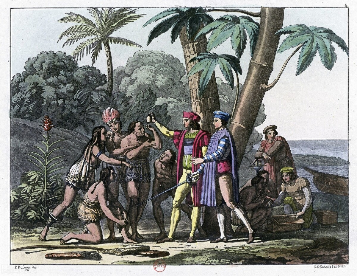 他们派出了第一批登岸的、武装过后的十五六个人,他们划着桨到了浅水区,正午时分,他们终于登上了美洲海岸,并得到了当地印第安人的救助。