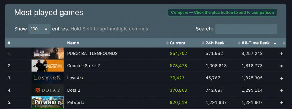 据 SteamDB 数据显示,《幻兽帕鲁》的同时在线峰值人数达到 129 万,成为了除 PUBG 外,Steam 历史上付费游戏中在线玩家数量最高的游戏。而在游戏发售仅三天后,官方便宣布《幻兽帕鲁》销量突破 400 万份。