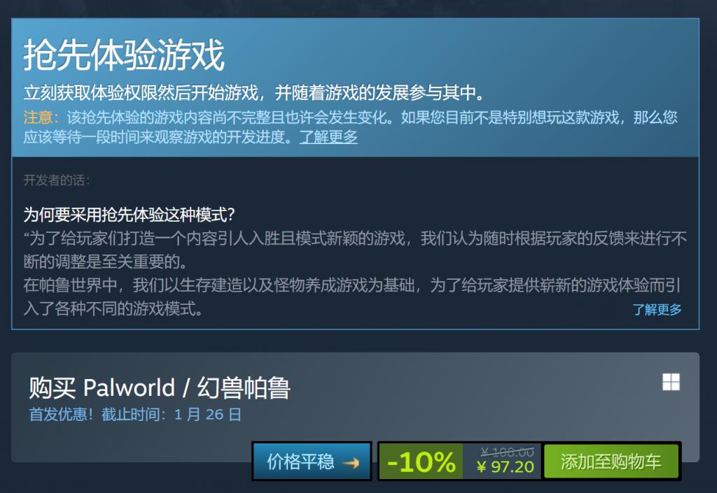 在售价方面,国区的定价为 108 元,首销优惠价 97.2 元,相较于同类的 3A 游戏而言,这一价格比较良心。此外,目前发布的是抢先体验版本已经包含了极其丰富的内容,这对于热衷于尝试新游戏的玩家来说无疑是一大吸引力。