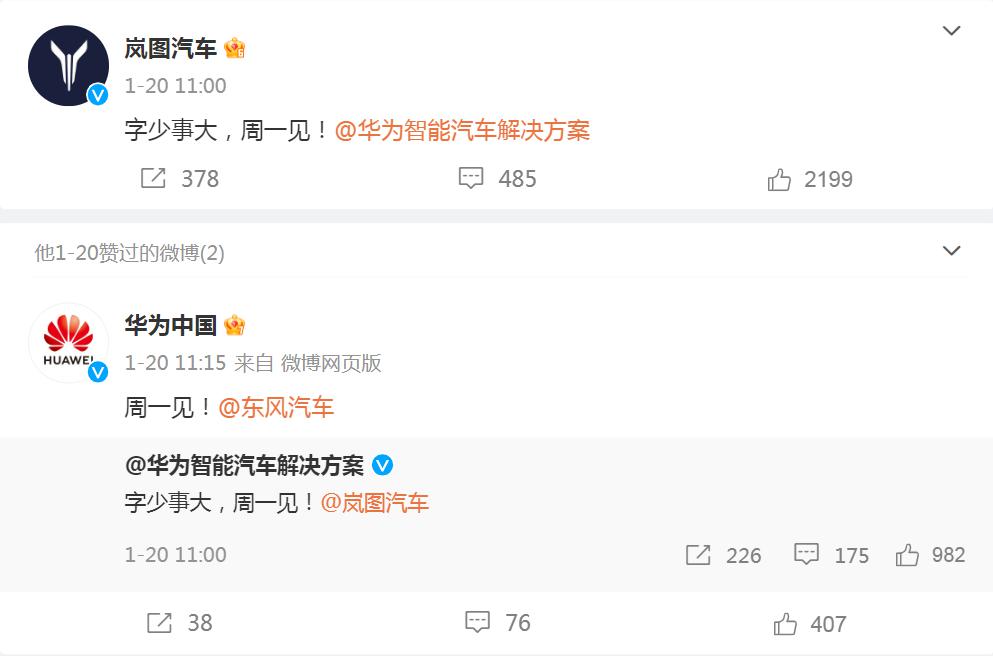 1 月 20 日上午,华为智能汽车解决方案官微和岚图官微隔空对话,宣布:" 字少事大,周一见!" 随后,华为中国和东风汽车转发上述信息,同时一致互动称 " 周一见 ",疑似集体暗示华为将与东风汽车旗下岚图汽车会有大事发生。