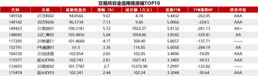 据 Choice 数据统计显示,今日交易所市场非金信用债涨幅排行前五的分别是:21 万科 02、20 万科 06、21 昆投 01、22 仁寿 02、23 希望 E1。具体如下:
