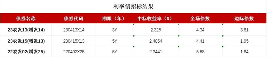 银行间主要利率债收益率全线下行,截止北京时间 16:30,10 年期国债活跃券 230026 收益率下行 1.1bp 报 2.493%,5 年期国债活跃券 230022 收益率下行 1bp 报 2.3775%,10 年期国开活跃券 230210 收益率下行 1.45bp 报 2.688%。