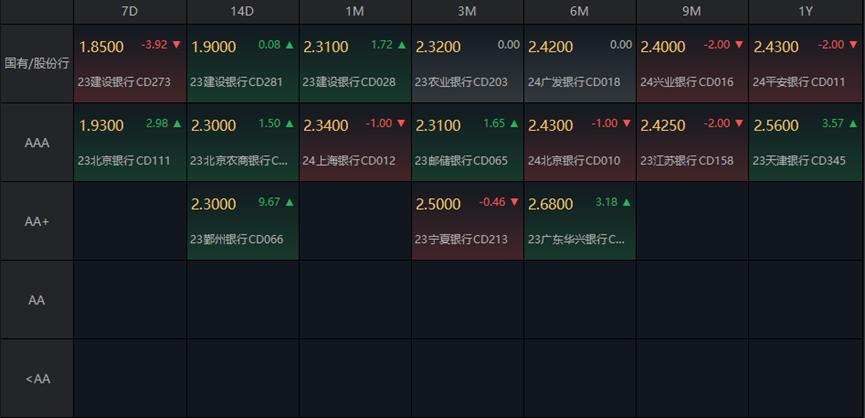 一级存单方面,今日 6M 期国股在 2.40 位置需求较好,1Y 期国股报在 2.42 的位置。二级存单方面,3M 国股成交在 2.32 附近,较前一交易日持平,1Y 国股成交在 2.43% 位置,较昨日下行 2bp。