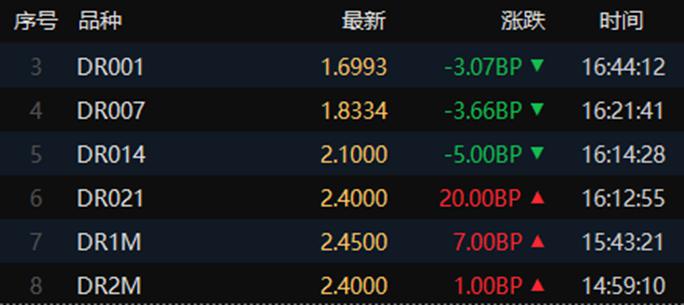 银行间回购定盘利率多数下跌。FR001 报 1.9000%,涨 4.00 个基点;FR007 报 2.1000%,跌 5.00 个基点;FR014 报 2.3093%,跌 9.07 个基点。