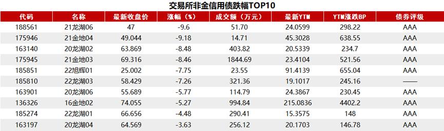 据 Choice 数据统计显示,今日交易所市场非金信用债跌幅排行前五的分别是:21 龙湖 06、21 金地 04、20 龙湖 02、21 金地 03、22 旭辉 01。具体如下: