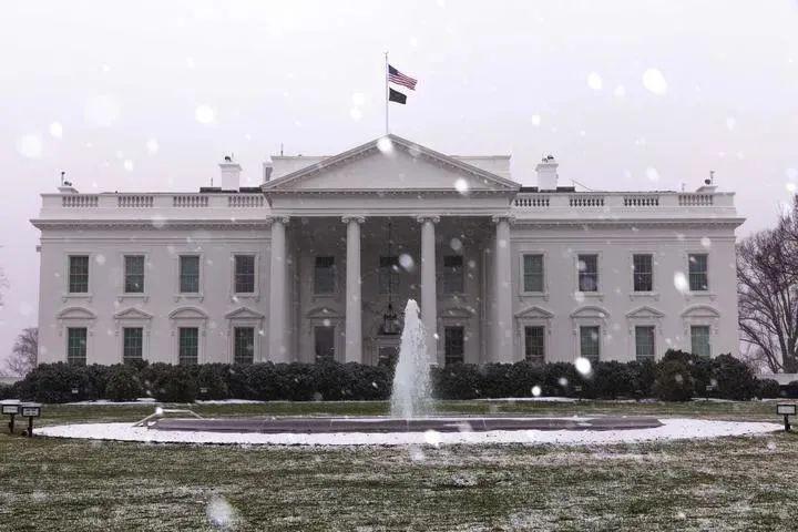 这是 1 月 15 日在美国首都华盛顿拍摄的雪中的白宫。新华社发(阿伦 摄)