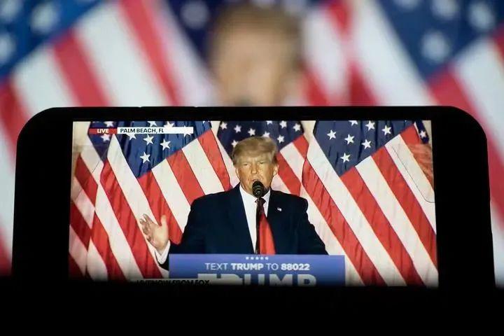 2022 年 11 月 15 日拍摄的电子屏幕显示,美国前总统、共和党人特朗普在佛罗里达州的海湖庄园发表讲话。新华社记者 刘杰 摄
